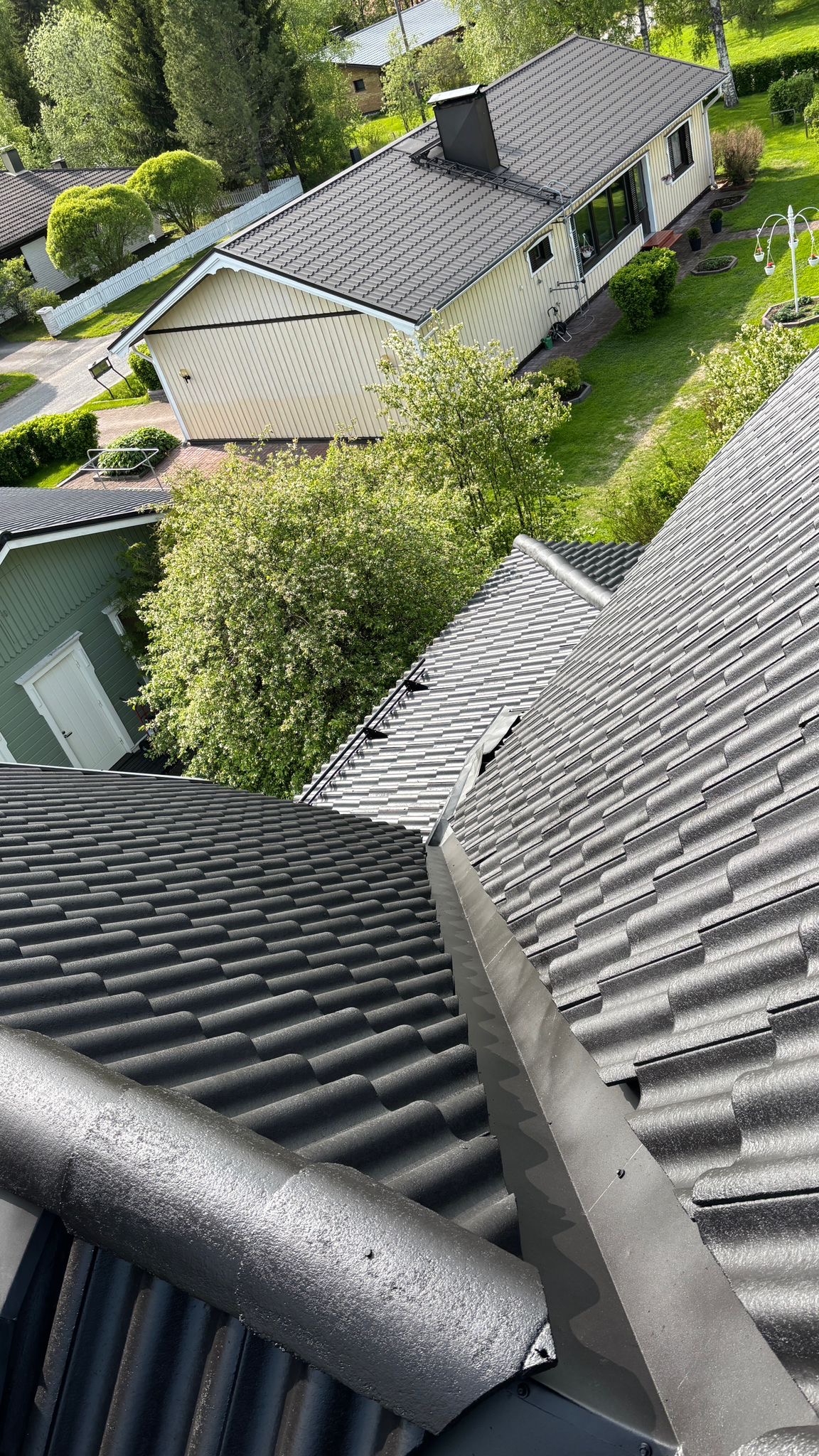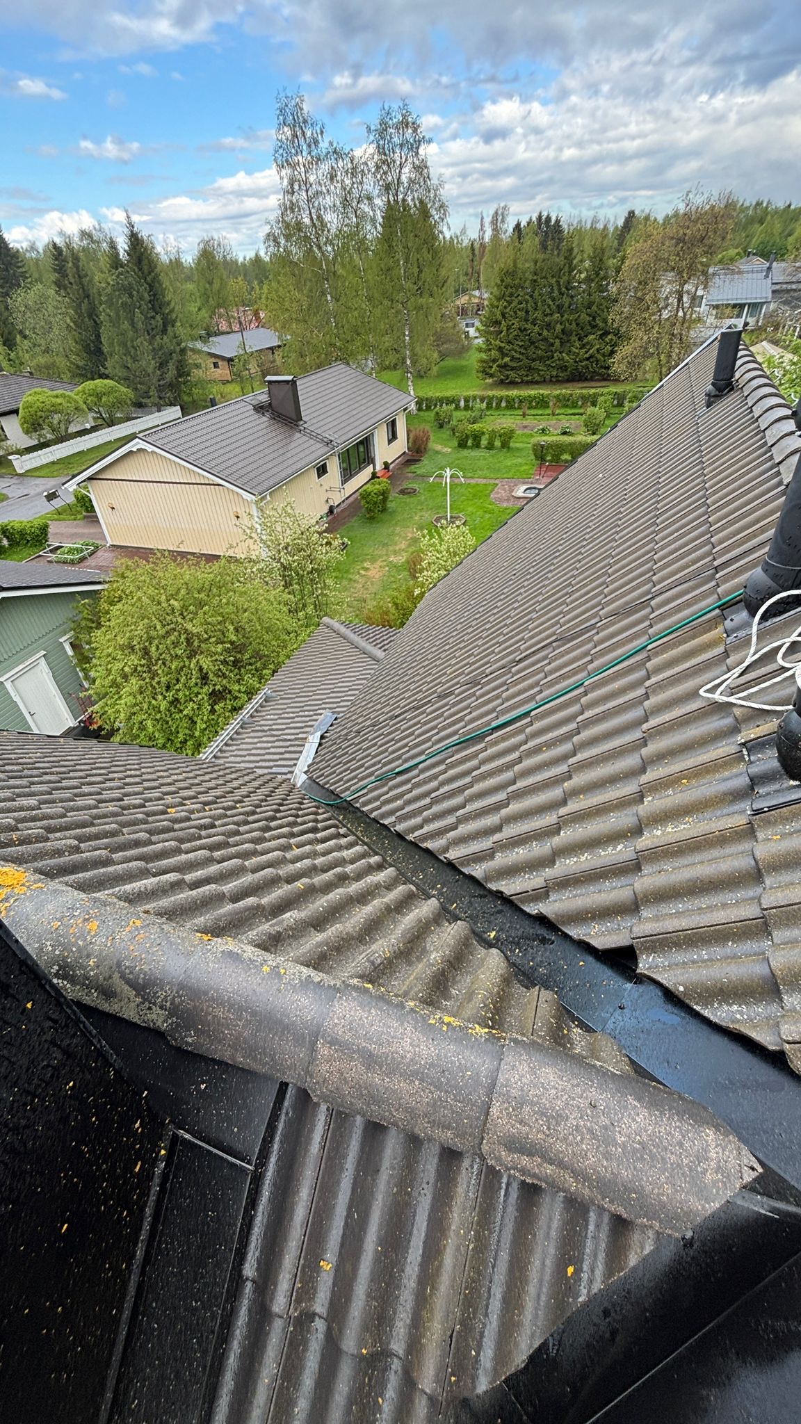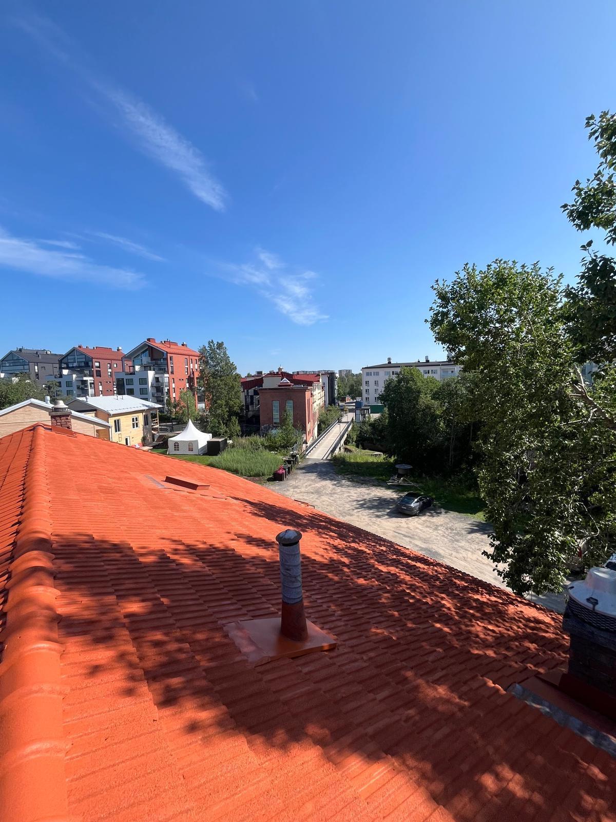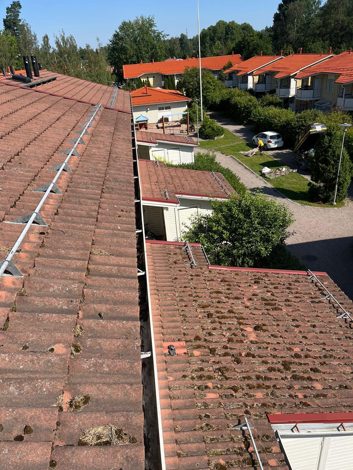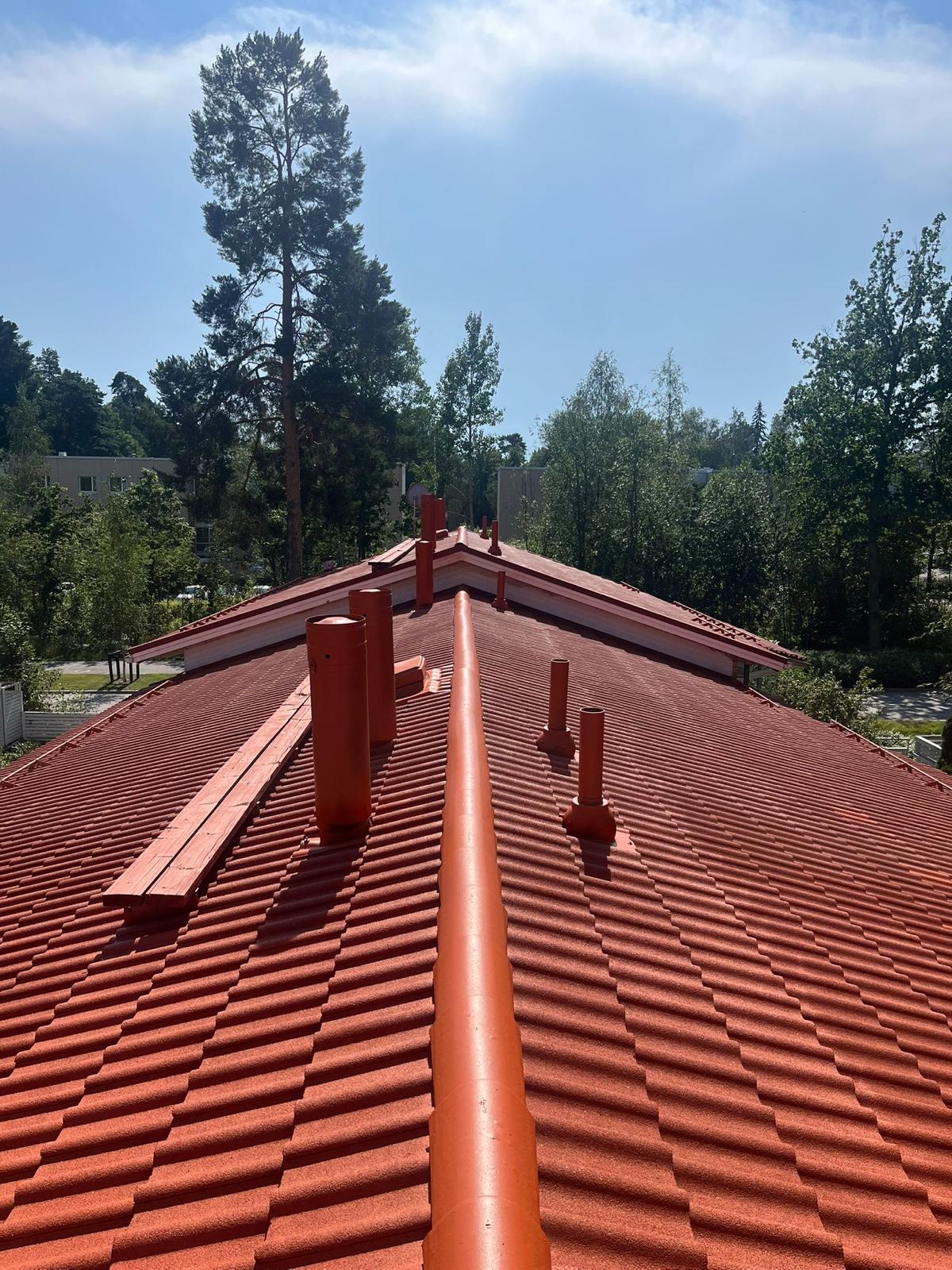 Tiilikattoon toteutettiin huolellinen pesu, kasvustontorjunta-aineen levitys sekä kahteen kertaan maalaus.